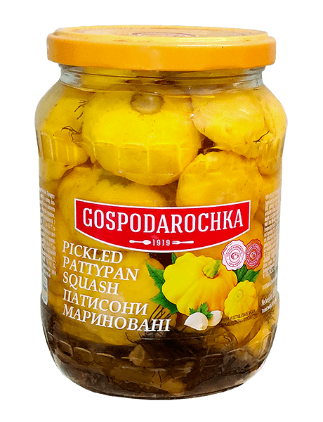 Ingredients: pattypan squash, drinking water, sugar, table salt, dill greens and/or parsley greens, acidity regulator – acetic acid, preservative – potassium sorbate Е 202, garlic, black peppercorn, bay leaf.Nutritional value of 100 g of the product contains: proteins – 0,3 g, fats – 0 g, saturated fats – 0 g, carbohydrates – 4,0 g, sugars – 3,8 g, salt – 1,6 g.
