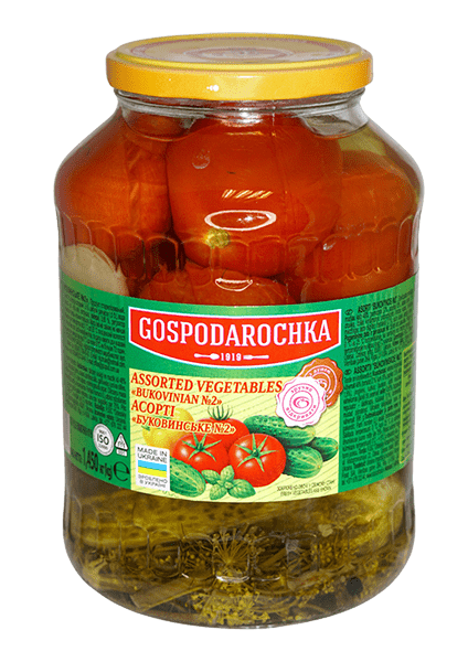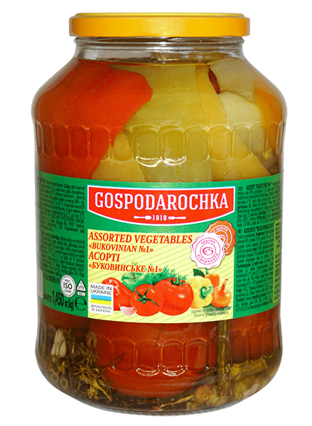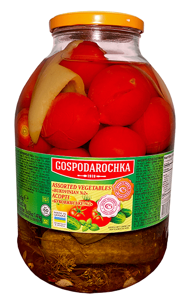 Ingredients: tomatoes, cucumbers, sweet bell pepper, onion, drinking water, sugar, table salt, dill greens and/or parsley greens, and/or celery greens, acidity regulator - acetic acid, garlic, pods of red chili pepper, black peppercorn, bay leaf.Nutritional value of 100 g of the product contains: proteins - 0,3 g, fats - 0 g, saturated fats - 0 g, carbohydrates - 4,0 g, sugars - 4,0 g, salt - 3,0 g.